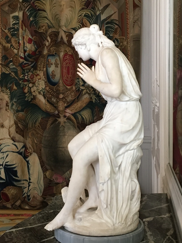À ma gauche, sur un banc élevé, une jeune fille est assise sur un banc haut, en train de charger son téléphone portable. Tournée vers le mur, elle aussi semble perdue dans un autre monde, totalement indifférente aux bruits environnants. Peut-être que son univers est très proche de celui de l'enfant, ou bien que tous deux vivent dans un même espace partagé.